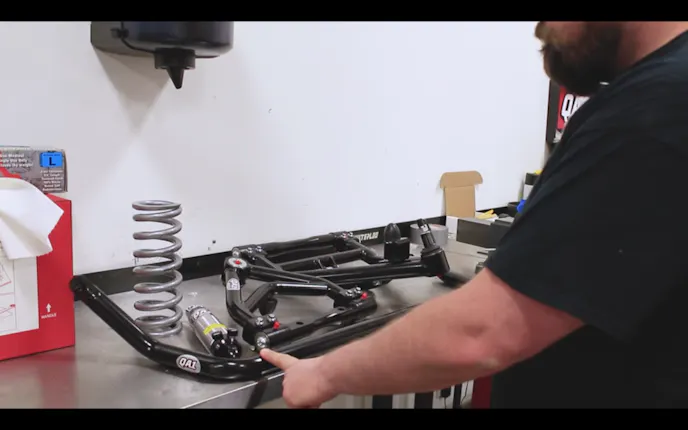 The frontend kit comes with a sway bar, upper control arms, lower control arms, and coilover shocks. “These control arms have our low-friction ball joints built into them,” Bill explains. “So, if you ever need to replace your ball joint, you just take this apart, you don’t have to press anything in or out. You just take this apart, pop in a new stud, and away you go.” Both the upper and lower control arms use the same design.