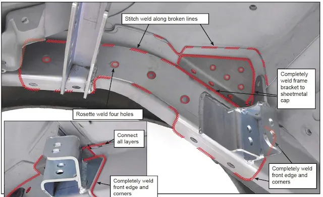 Our crew welded around the sheet metal reinforcement cap and rosette weld the 4-holes on the side of the frame rail, then ground the welds flush to allow the frame bracket to seat tightly against the bottom of the frame rail. We reinstalled the cradle assembly, clamped it securely in place and then installed the forward mount bolts.