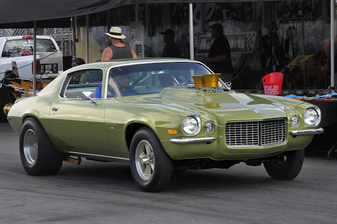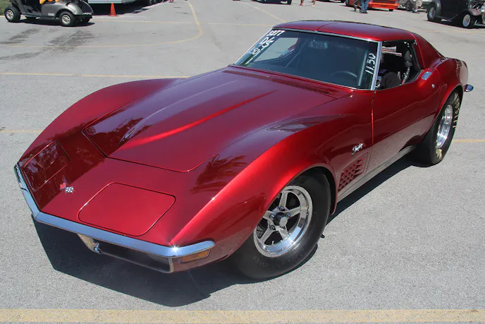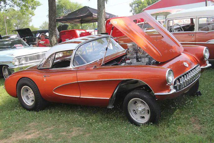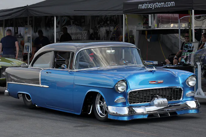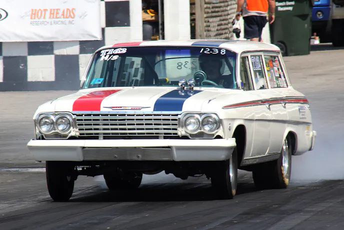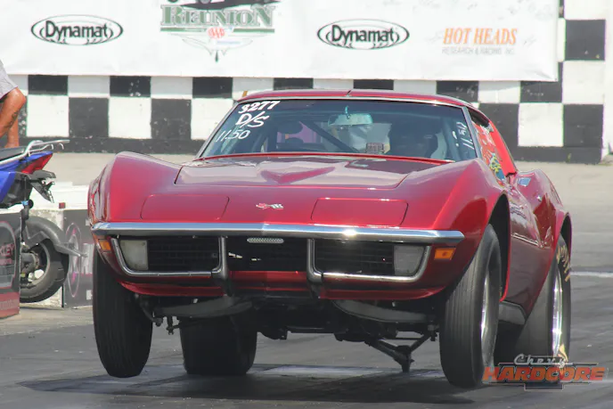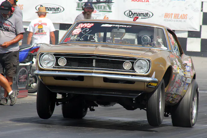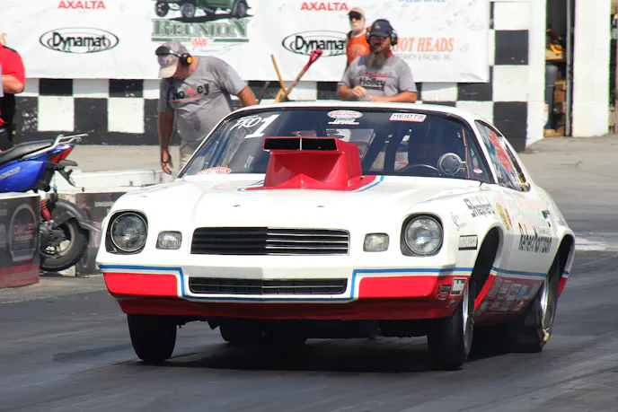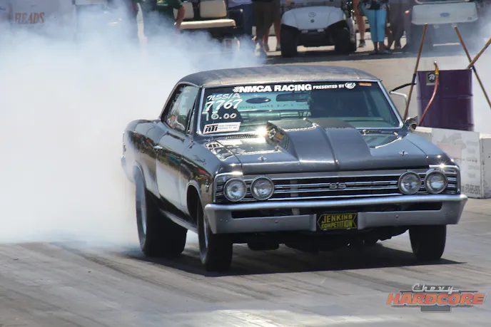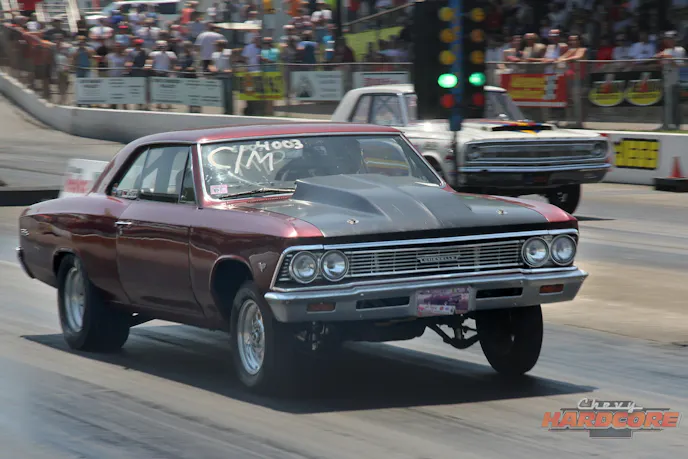 Vintage Pro Stock action with the Reher & Morrison Camaro. A flamboyant 409-powered Chevy coupe. A candy red Corvette waits in the staging lanes, and a slick '66 Chevelle motors through the Show 'N Shine area.