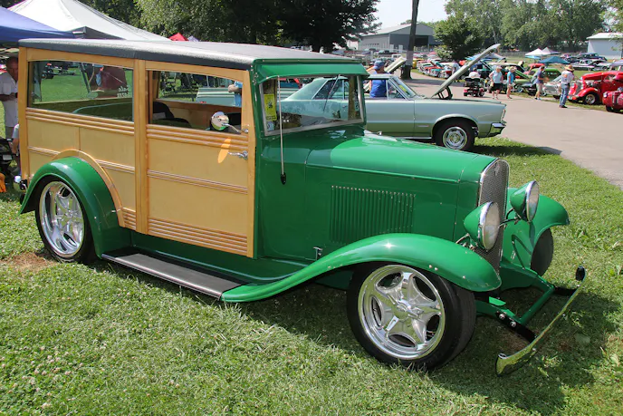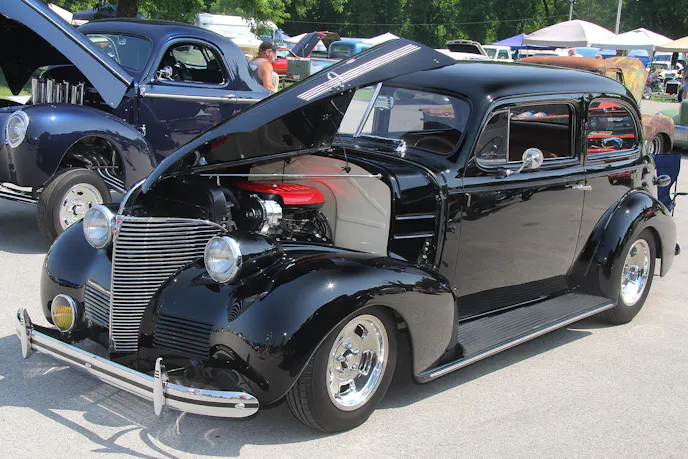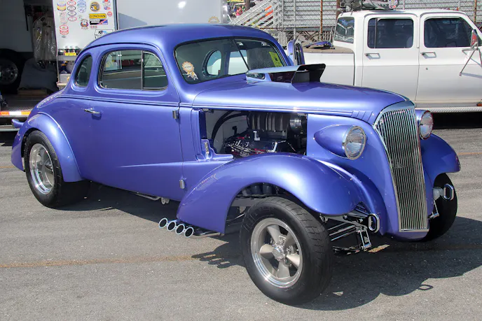 This beautiful 1937 Chevy coupe, in full gasser trim, was powered by a rare Arias Hemi-headed Chevy, and Chevy street rods were well represented by this 1939 sedan, and the Kelly Green woody wagon in the Axalta Show 'N shine.