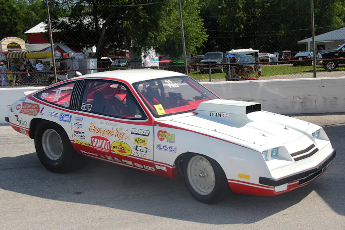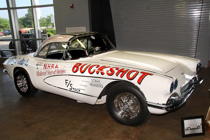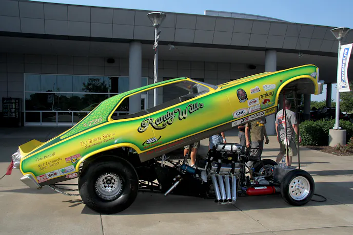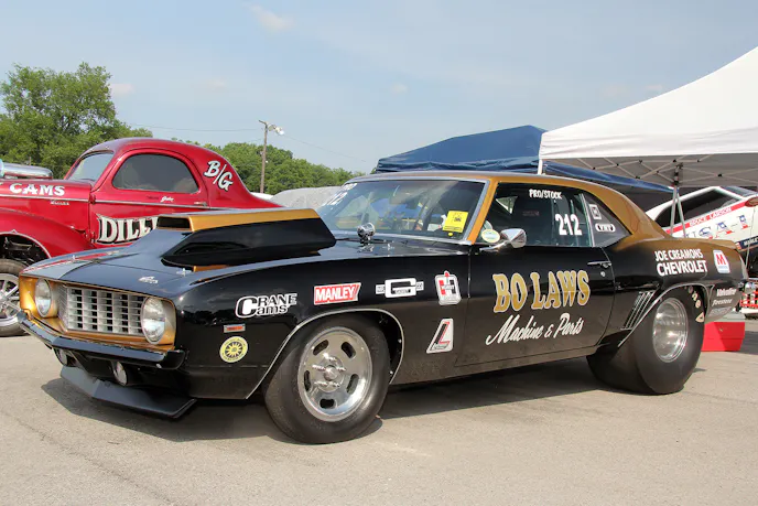 Race cars with history: Bo Laws' '69 Camaro Pro Stocker, The Larry Lombardo-driven "Grumpy" Jenkins Monza Pro Stock racer, Lombardo's own record-holding Corvette stocker, and Randy Walls' Chevy-powered nitro funny car.