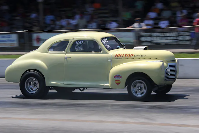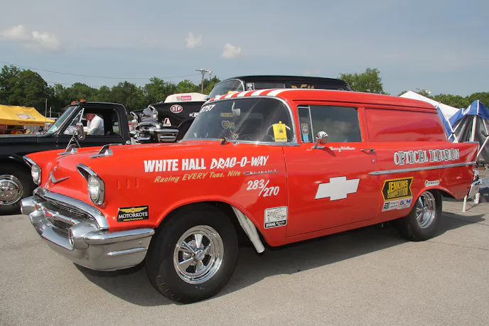Drag racers on parade. A '40 Chevy coupe works the drag strip, a '67 Camaro launches hard, a '63 long-roof runs low 12's, and a '57 Chevy sedan delivery Jr. Stocker on display.