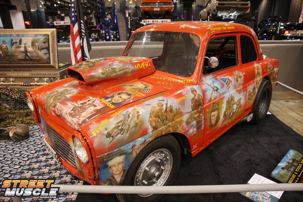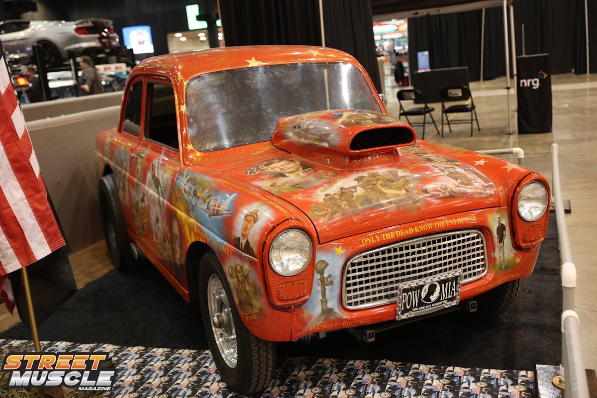 Joe Ballard’s 1958 Anglia is a tribute to active-duty soldiers and veterans of the United States military. Ballard commissioned Dave Jones to spray the Anglia in PPG Torch Red with Vibrance Big Flake Gold and Orange hues. Chris Macmahan was tasked with airbrushing the amazing images of soldiers on the vehicle. The final product is a rolling piece of art that’s powered by a 302 cubic-inch small block Ford from Holman Moody that’s backed by a 4-speed transmission.