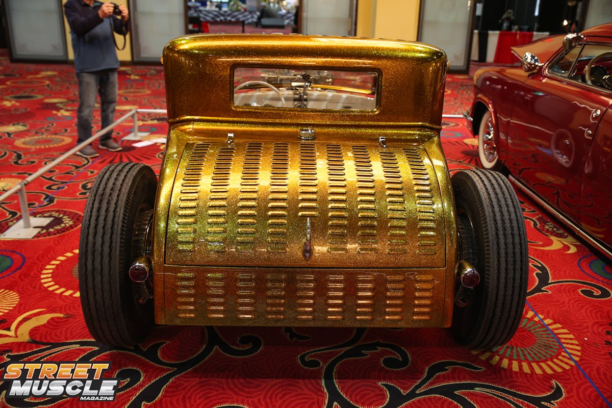 Jason Steeves brought his “Dirty Dandelion” 1927 Chevy Coupe to the show and boy it drew a crowd. Sussex Engines built the cool 1955 354 cubic-inch Hemi mill that’s backed by a Super T-10 transmission. The House Of Kolor Pagen Gold Candy Silver Flake and Pear White paint just make the Dirty Dandelion pop. Metal Coaters created some amazing chrome parts that work in unison with the wild paint. The entire package was put together by the craftsman at Binbrook Speed & Custom.