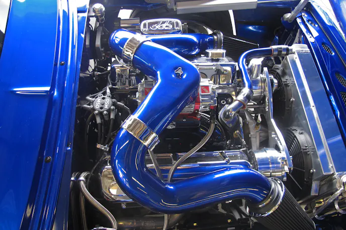 The inside is definitely a work of art. Looking like a basic restomod, the car is anything but. With a leather-wrapped dash, Auto Meter gauges, and faux alligator skin appointments, this is one cool cockpit.