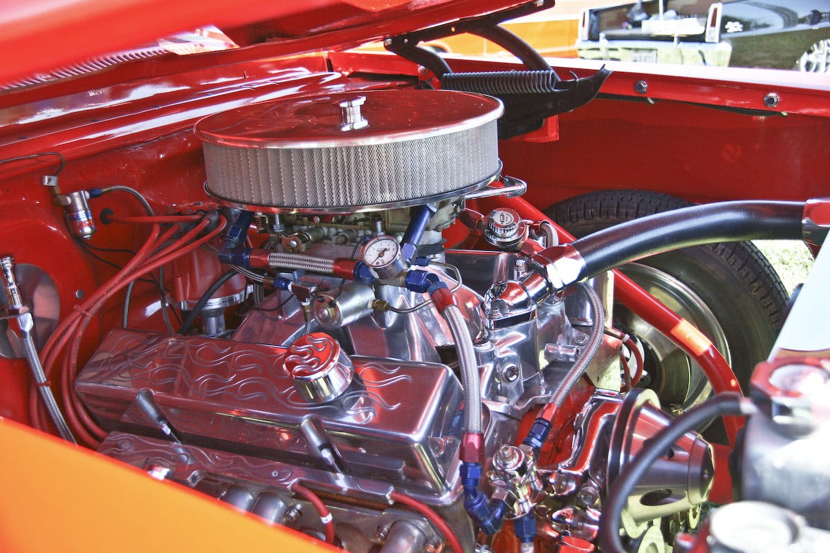 Under the cowl-induction hood is a 500 horsepower, 502 cubic-inch crate engine. Managing the beast is a Detroit Speed, manually-shifted six-speed transmission.