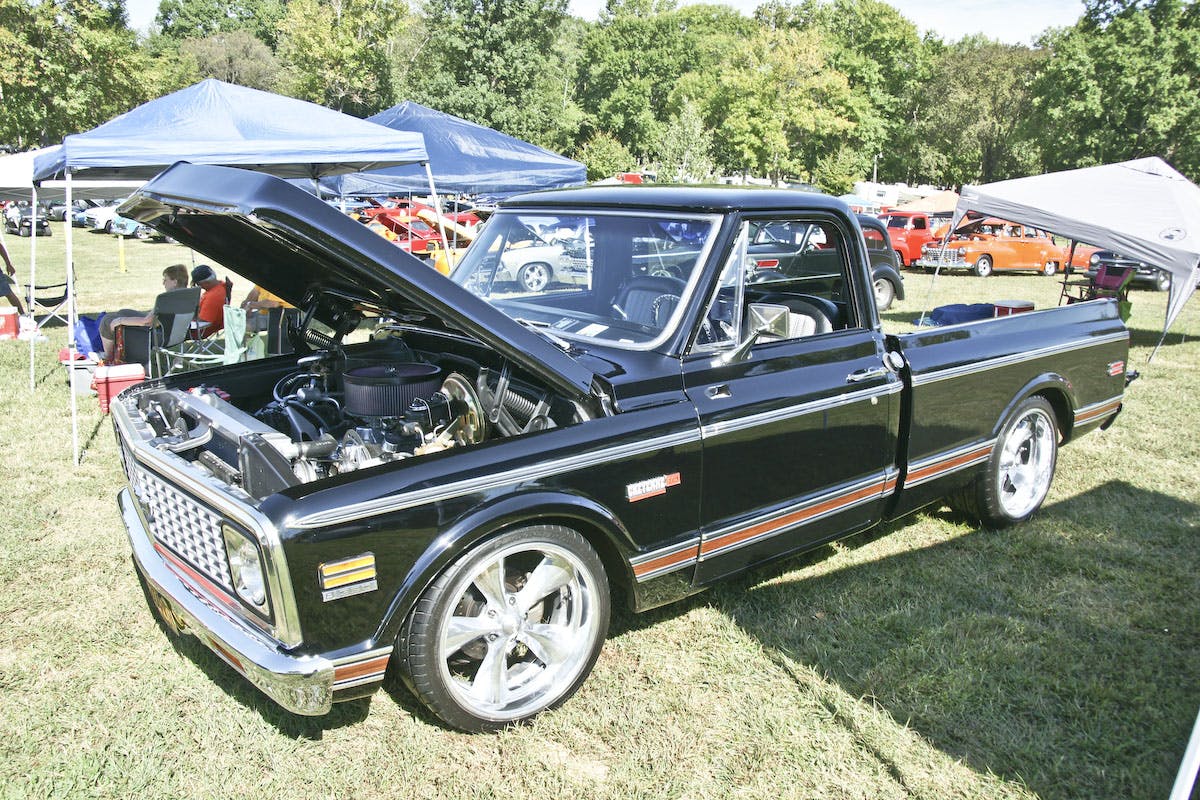 Under the hood a 462 cubic-inch big-block with 525 horsepower uses a solid-lifter camshaft and twin carburetors. CPP disc brakes were mounted on the front, and factory drum brakes are retained on the rear. An Air Ride suspension was installed, and the air compressor and tank were tucked under the bed. A staggered set of 18- and 20-inch American Racing wheels sit nicely inside the truck’s fenders to complete the great look.