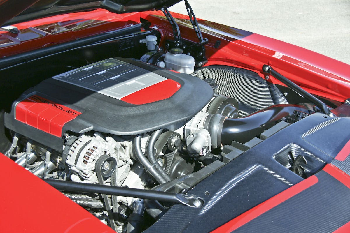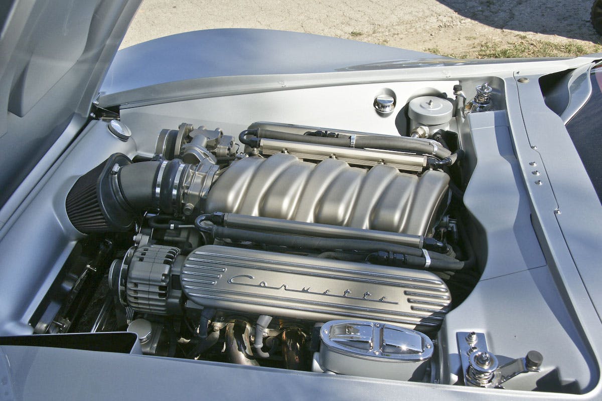 Under the cowl-induction hood is a 500 horsepower, 502 cubic-inch crate engine. Managing the beast is a Detroit Speed, manually-shifted six-speed transmission.