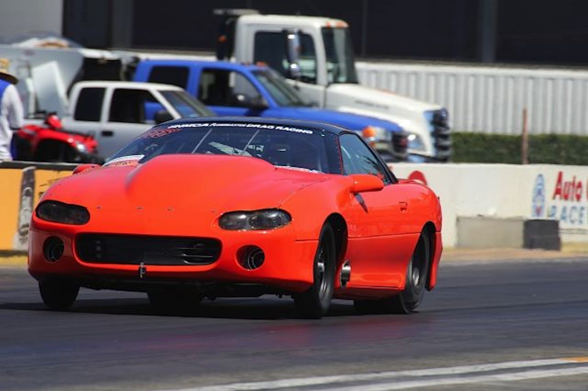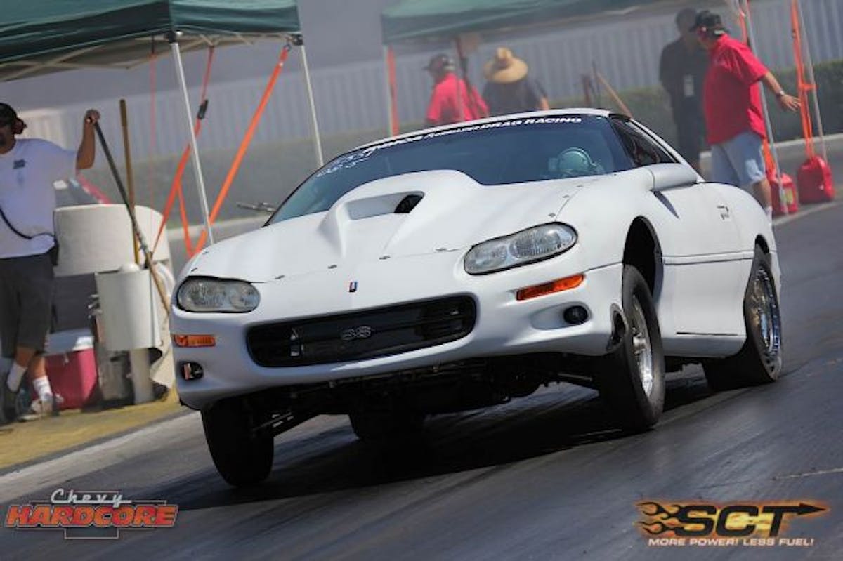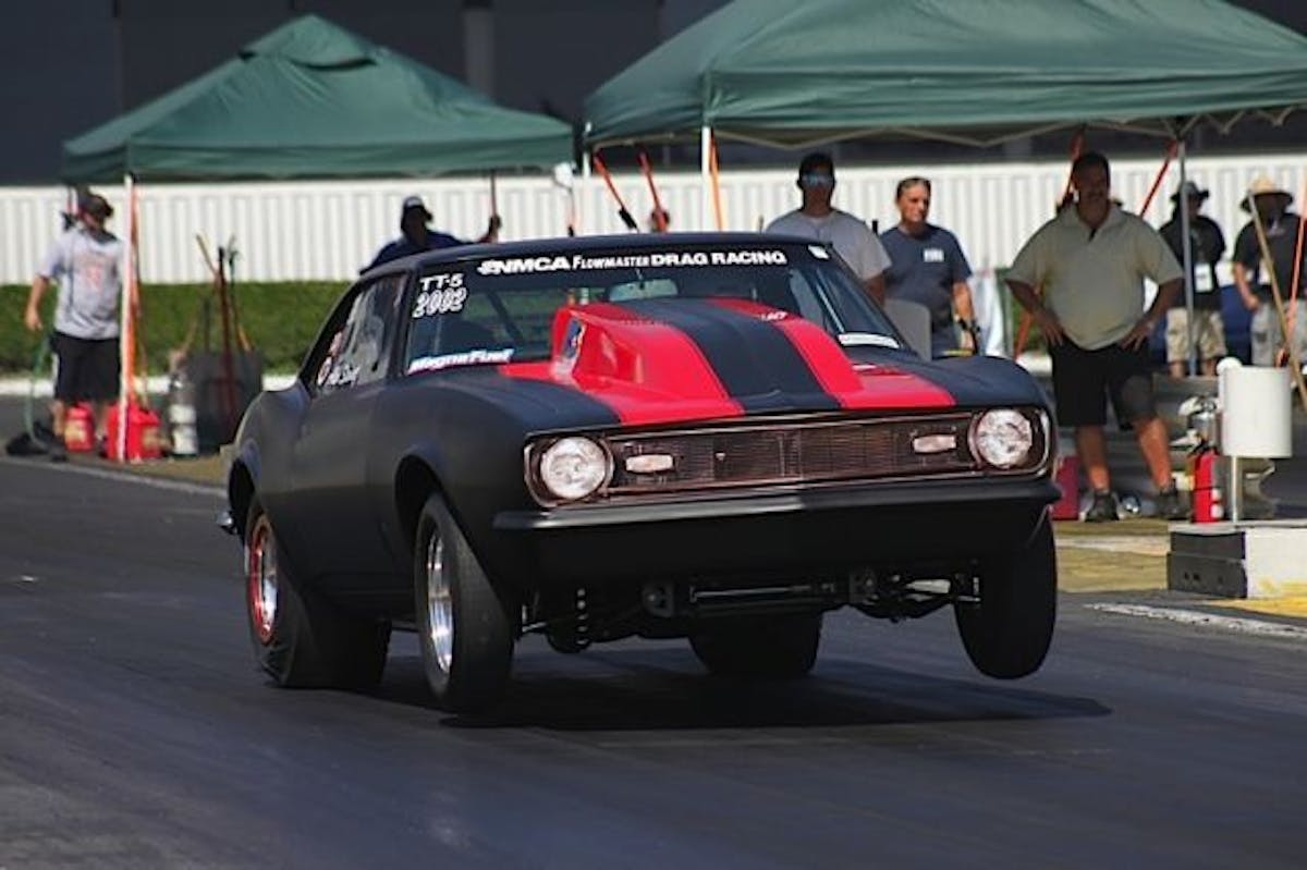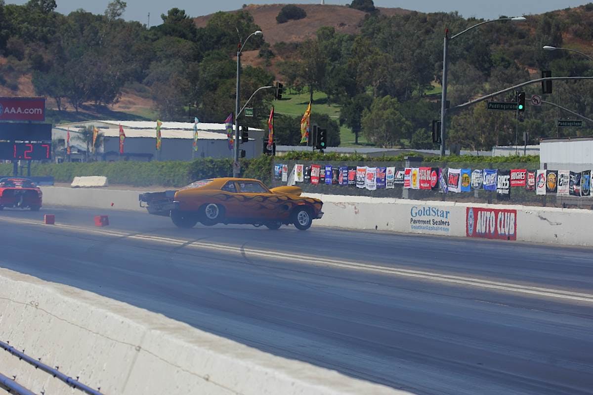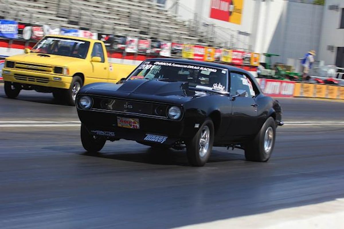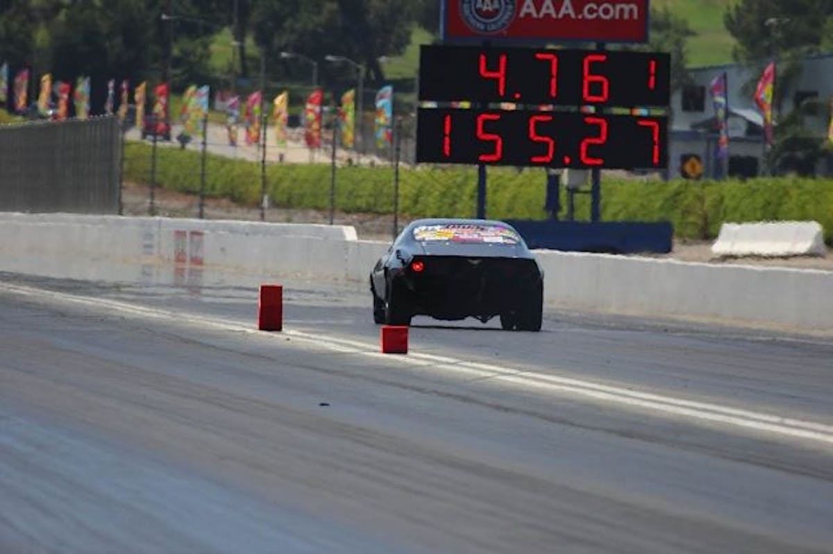 Mike Saiki's first qualifying round was a stunner; nearly placing his 'Vette on the bumper. Saiki ended up with a 6.902 at 104.80mph.Outlaw 8.5 saw Joshua Gomez smack the back tires in his '00 Camaro. Gomez managed a 5.81 at 126.40 mph.Simi Valley, California native Dan Hale slipped out a 5.89 at 120 mph in his twin-turbo '89 Mustang.Kevin Young in the Outlaw class locked away second place for first round of qualifying by running his '86 Chevy Camaro to a 7.88 at 179 mph.Russ Delia's, 355ci. small-block powered '68 Camaro edged out the Chevy-powered Toyota pickup for a 5.072 at 147.73 mph.Al Jimenez was messing around, carrying the front tires of his '72 Camaro from the lights. Jimenez's efforts were good for 4.77 at 157.50; landing his top spot for round one of qualifying.