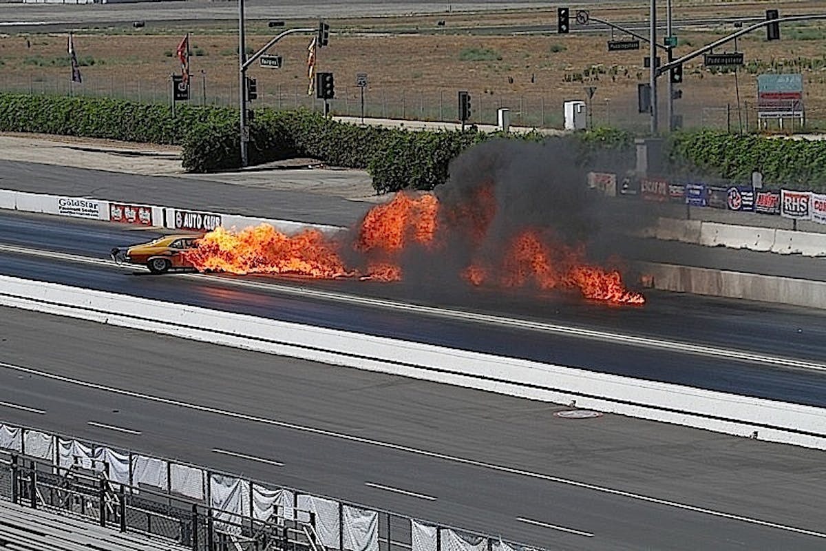 Unfortunately, Terry Barkley had a serious collision with the opposing lane. Barkley's front-mounted fuel tank instantly exploded and turned the Nova into a rolling fireball. Luckily, Barkley managed to walk away from the incident with minor injuries to his left leg.