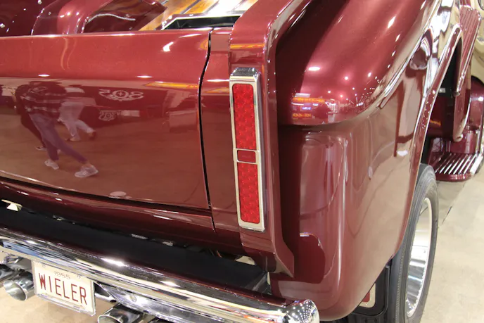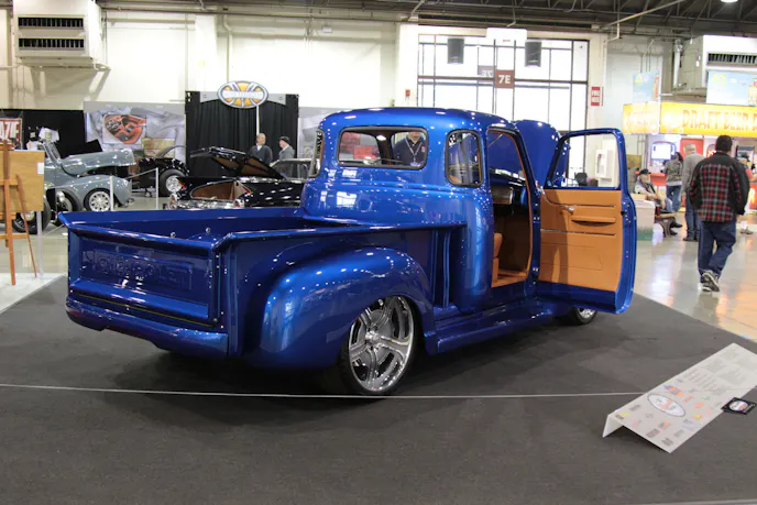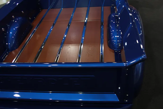 We went from a red-on-red truck to an Electrified Blue 3100, and this young builder did an amazing job with this one. Brad Apicella of Apicella Designs laid down some of the brightest blue paint we saw at the show. Under the hood, he planted a Chevrolet Performance LSA crate engine and a 6L90E six-speed automatic. Keeping the engine clean and looking like it belonged there, he mounted a Concept One front-drive system and touched up on some of the details with the same paint as the exterior.