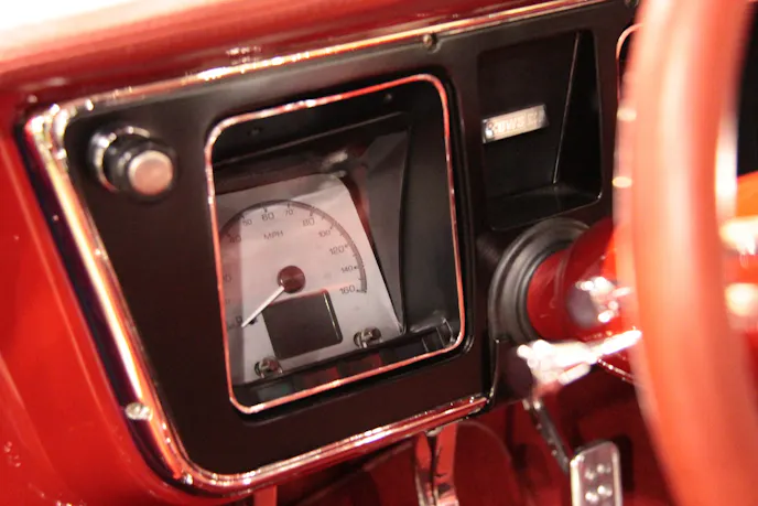 If you’re checking out those wheels, you’ll have to get in touch with Mike Curtis Designs (American Hot Rod fame) to make you a set. The interior and dashboard looks more like a 1960s futuristic design and works well with the build. Another nice touch is the redline tires, reminiscent of decades past. The car looks fun, and the Art Morrison sport chassis equipped with Ridetech shocks and a billet four-link rear make it handle like a Corvette. Wilwood brakes keep it slowed down long enough to check it out.