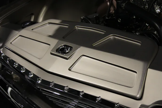One thing that really stood out about this wagon was the black finish on the hood support and billet hinges. It was actually nice to see something other than polished billet all over the place — not that there’s anything wrong with it. The contrast came out well and stood out. The rest of the underhood was just as clean, with a satin finish on the engine components which matched the interior.
