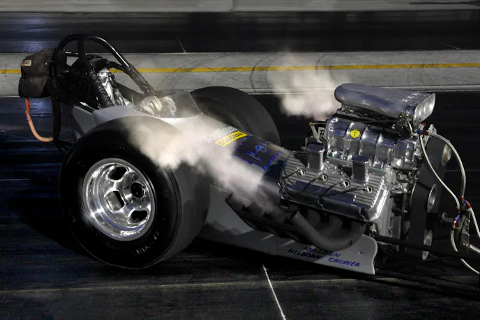 The spectator side of the track has vintage baseball-stadium seating that was probably made when the Dodgers were still in Brooklyn. Behind the starting line is a 1/3-mile bullring race track. Originally intended for stock cars, it is now mostly used as vendor space, and for drifting competitions. Most things on the facility are made of wood, and are cracked and worn. The paint is old and faded, but this place is the real deal. It’s a perfect venue for a look back at drag racing history.