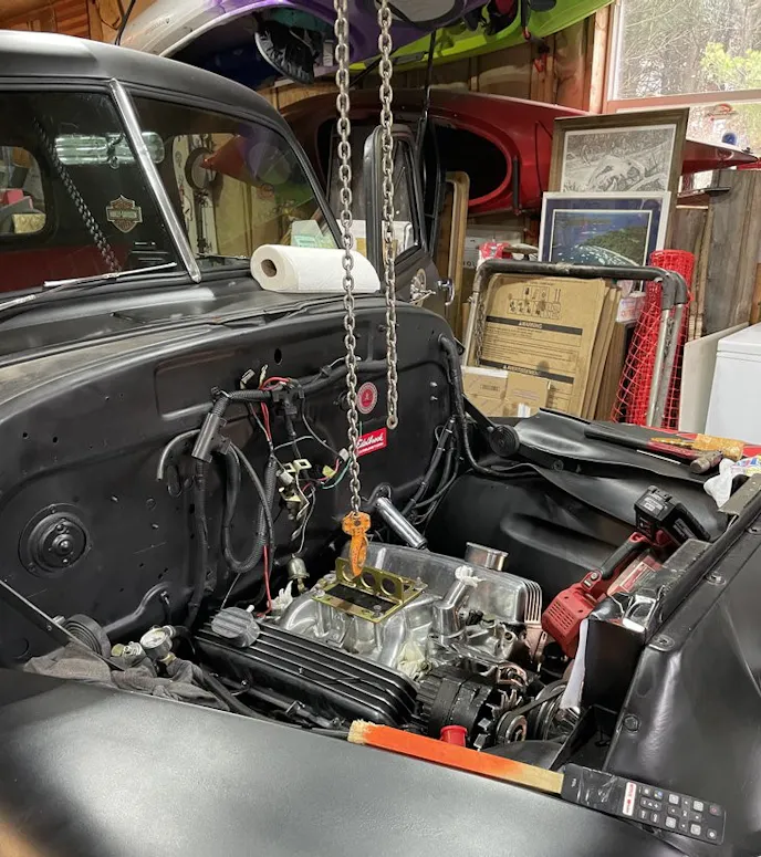 The headers meant the steering shaft needed to be rerouted so it didn’t interfere with the exhaust flow. Robert adjusted the Ididit column slightly to give the steering shafts and universal joints better alignment and to give a nicer angle to the steering column inside the cab. There was also some interference with the mechanical fuel pump on the other side of the engine. It would hit the suspension’s upper control arm. Robert quickly realized why an external fuel pump was originally used in the installation so many years ago. The new Blueprint engine also featured a Holley carb, so Robert massaged the linkage mounts to fit the new four-barrel.