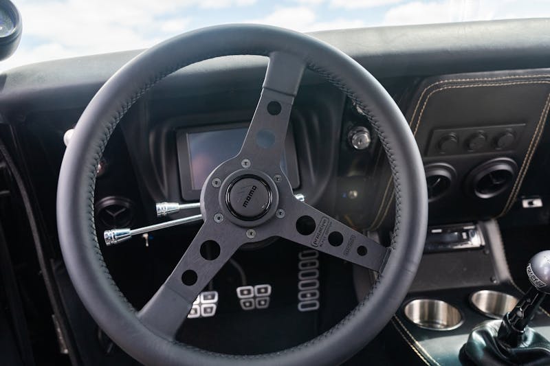 The steering wheel is a MOMO Prototipo Black Edition, giving it a classic European sports car feel, while the dash is completely digital thanks to a Holley EFI LCD screen. That means you get modern gauge readouts and tuning info in a compact, customizable interface.