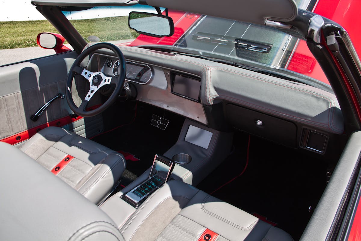 The installation of the custom gray and red leather TMI interior kit was the next step. The kit is stretched over the stock seat frames; installed in-house by The Custom Shop crew. Deno’s Auto Upholstery covered the dash that houses the Dakota Digital gauges and Sony head unit. The custom center console was also covered in gray leather, and houses the shifter, stainless-steel cup holder, and Holley’s touchscreen monitor that controls the fuel-injection system. The trunk also received plenty of TLC, and blends nicely with the rest of the interior. The trunk houses Sony amplifiers that supply approximately 4,000 watts of power to a pair of 12-inch Sony subwoofers and four Sony 6½-inch component speakers. The custom trunk panels were designed so they could easily be removed for storage access. Finishing off the build is a Haartz convertible cloth top.