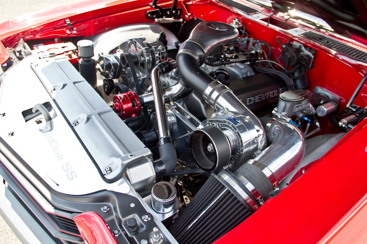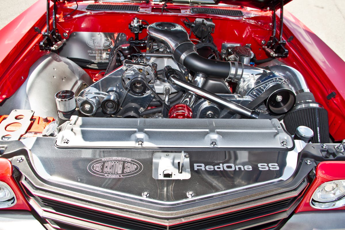 With the chassis squared away, it was time to add some go power. The Chevelle’s propulsion comes from a Chevrolet Performance 572 cubic-inch crate engine. Surprisingly, the delivered 620 horsepower was not enough for Tom, so a Procharger F1-series supercharger was added. The combination brings the horsepower figures to nearly 1,000, with roughly seven to eight pounds of boost. To keep the drivability of the car, a Holley Terminator self-tuning fuel-injection system was installed.