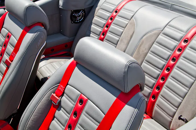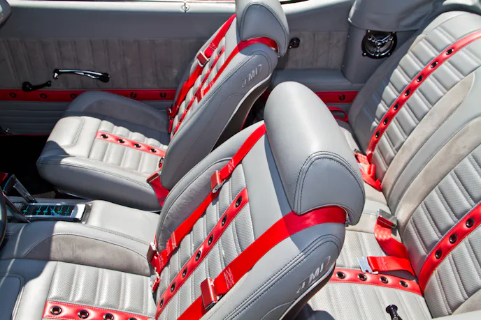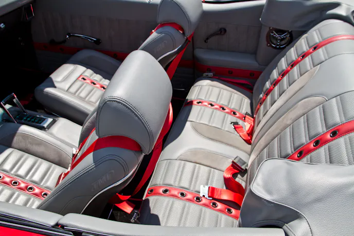 The installation of the custom gray and red leather TMI interior kit was the next step. The kit is stretched over the stock seat frames; installed in-house by The Custom Shop crew. Deno’s Auto Upholstery covered the dash that houses the Dakota Digital gauges and Sony head unit. The custom center console was also covered in gray leather, and houses the shifter, stainless-steel cup holder, and Holley’s touchscreen monitor that controls the fuel-injection system. The trunk also received plenty of TLC, and blends nicely with the rest of the interior. The trunk houses Sony amplifiers that supply approximately 4,000 watts of power to a pair of 12-inch Sony subwoofers and four Sony 6½-inch component speakers. The custom trunk panels were designed so they could easily be removed for storage access. Finishing off the build is a Haartz convertible cloth top.