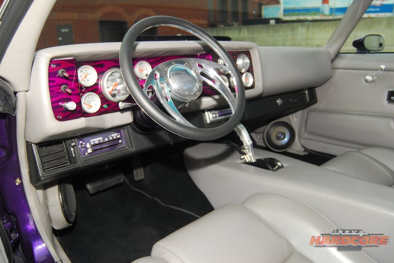 During the rebuild process, Brian decided to make sure the car was rebuilt in top-notch fashion. To that end, he started by replaced the quarter-panels, door skins, front fenders, both lower valances, and even the decklid. Basically, it’s very close to a new body. Once the metalwork was complete and the body smoothed to perfection, he then sprayed the car with a healthy slathering of a custom-purple blend of his creation.