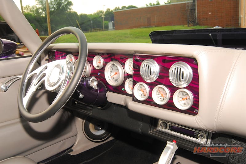 The custom-made dash panel is filled with a bevy of Auto Meter gauges for monitoring the engine’s vitals. Although the engine surely creates its own song while driving, tunes are via a Kenwood stereo. Finally, cruising in comfort is possible via a Vintage Air A/C unit.