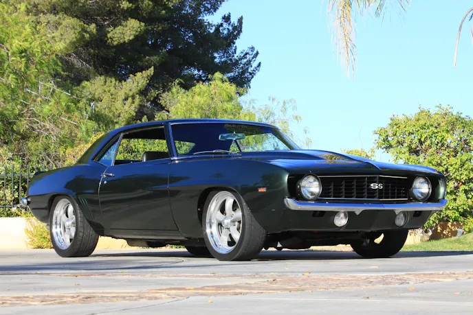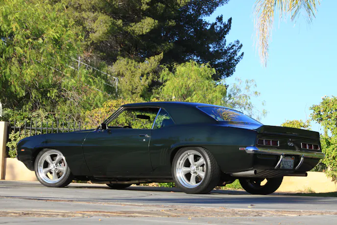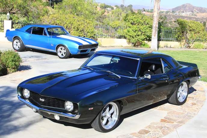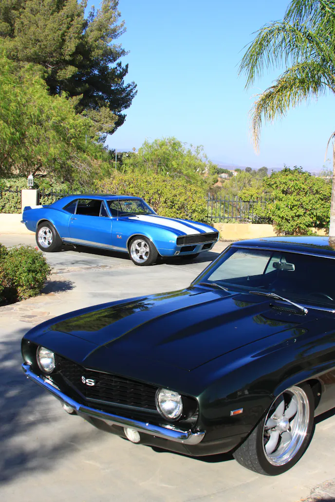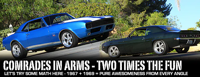Two Camaros, yet two very different approaches to vintage American steel. The '67 was born for drag racing while the '69 is a more dignified road-race ride. Either, well suited for Van Nuys Boulevard in the bad old days.