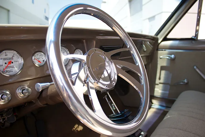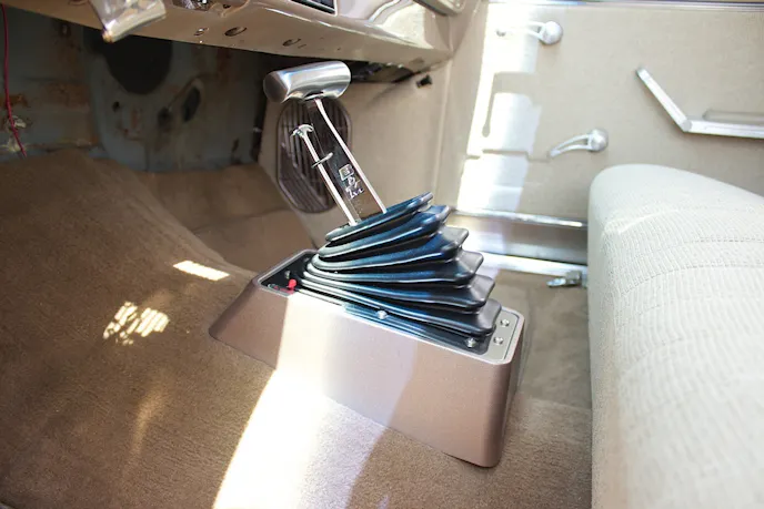 Morrow custom fabricated a new dash fitted with white-face Auto Meter gauges. In addition to a speedometer and tachometer, he added fuel, water temperature, and oil pressure gauges. The steering wheel is a Budnik Tusk II and the transmission is operated by a B&M Star Shifter.