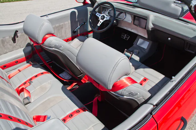 The installation of the custom gray and red leather TMI interior kit was the next step. The kit is stretched over the stock seat frames; installed in-house by The Custom Shop crew. Deno’s Auto Upholstery covered the dash that houses the Dakota Digital gauges and Sony head unit. The custom center console was also covered in gray leather, and houses the shifter, stainless-steel cup holder, and Holley’s touchscreen monitor that controls the fuel-injection system. The trunk also received plenty of TLC, and blends nicely with the rest of the interior. The trunk houses Sony amplifiers that supply approximately 4,000 watts of power to a pair of 12-inch Sony subwoofers and four Sony 6½-inch component speakers. The custom trunk panels were designed so they could easily be removed for storage access. Finishing off the build is a Haartz convertible cloth top.