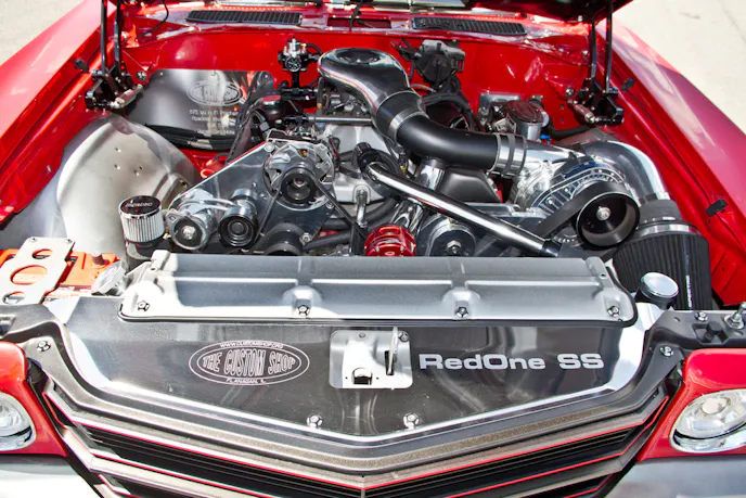 With the chassis squared away, it was time to add some go power. The Chevelle’s propulsion comes from a Chevrolet Performance 572 cubic-inch crate engine. Surprisingly, the delivered 620 horsepower was not enough for Tom, so a Procharger F1-series supercharger was added. The combination brings the horsepower figures to nearly 1,000, with roughly seven to eight pounds of boost. To keep the drivability of the car, a Holley Terminator self-tuning fuel-injection system was installed.
