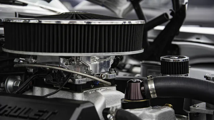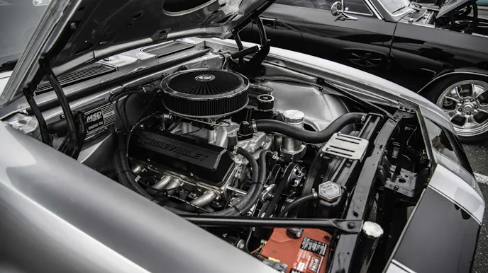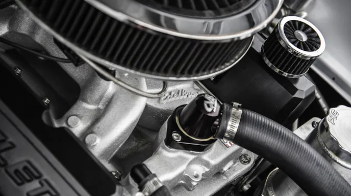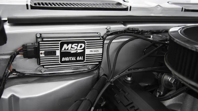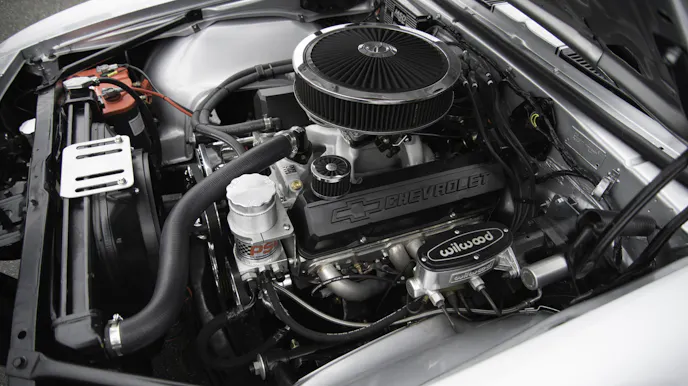 The black valve covers were originally orange. That is the way they came from Chevrolet Performance, but during the build process he had the idea that black would work better. Although the classic Chevy orange would have been cool, it’s hard to argue the validity of choosing the ultra-sleek look of the black valve covers in contrast to the silver paint and the aluminum and silver finishes on the engine. With the black air cleaner, the look is well-rounded.
