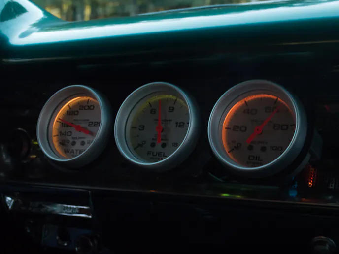 From the beginning, this car was a family affair for Andy. While working on the interior, he made sure things would be comfortable for him, his wife, and their two young children. He kept the bench seat already installed, so his wife could sit next to him, and then he had a custom bench seat made and placed between the rollbar down tubes in the back so his two children have a place to sit. “It would be the wife and I in the front, the kids in the back, and the chairs in the trunk,” he says. “We drive it to the track, race it, and drive it home.” And don’t think for a minute that this is just a good-looking car. Andy has blasted a best 1/4-mile time of 9.73 seconds.