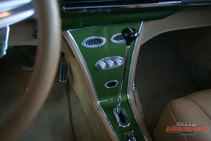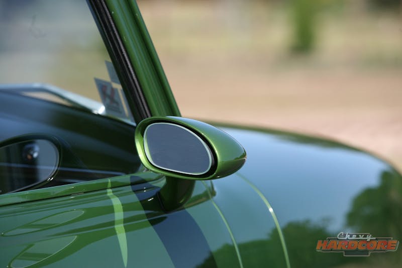 The stock, slightly modified chassis was removed to make room for a Roadster Shop perimeter frame with a Heidt’s Superide front suspension and four-bar rear suspension to support the 9-inch rear with a street-friendly 3.50 gear. Wheel rotation-disablers are from Wilwood.