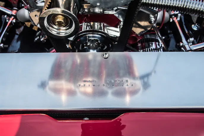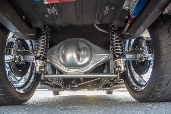 The car came with stock upper and lower control arms and springs that had been cut to lower the front end. “It was slammed to the ground,” Rick said. “But that wasn’t part of the original restoration.” He didn’t like how it rode when it was setup that way, so he swapped the stock stuff for Heidts front control arms and QA1 adjustable coilovers. It also has Wilwood disc brakes all the way around, a Ron Davis radiator, and an electric water pump.