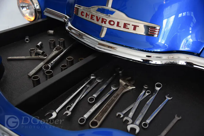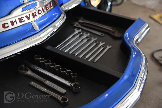 The final detail on the tool box – to authenticate the under hood look of a 1950 Chevy pickup – was the addition of a polished aluminum upper radiator tank from Champion Cooling Systems, complete with a billet radiator cap. This late addition to the design added just the right touch, according to Bob, and we couldn’t agree more.