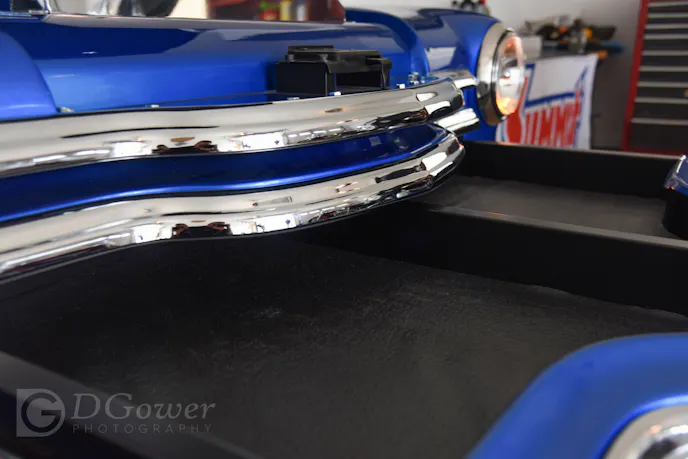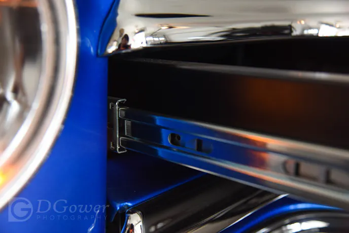 However, before you assume that this is simply a front clip reassembled to look like a tool box, there were a few modifications that went into the overall unit. “The modifications are quite involved,” Martin said. “We had to remove almost two feet of sheetmetal, rework all the panels for strength, and, because we wanted to use the original spring-style hood hinges, we had to re-engineer the structure of the hood and fabricate our own mounts to the frame.”