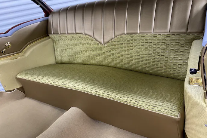 Thanks to the efforts of Ciadella Interiors, the Tribute ’55 uses pieces of 70-year-old, gold-threaded NOS material. Ciadella has been creating original and custom interiors for 1949-1965 Chevrolets since the 1970s. The family owned business and its experienced craftsmen created the seats, interior panels, and headliner for the Tribute ’55 Chevy. Finding the cloth insert material was a challenge because, like most other detailed information about the car, there were no records kept.