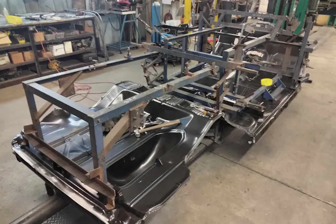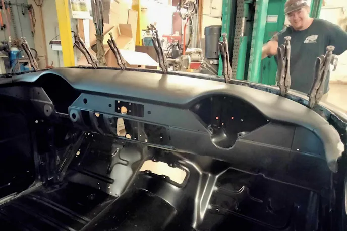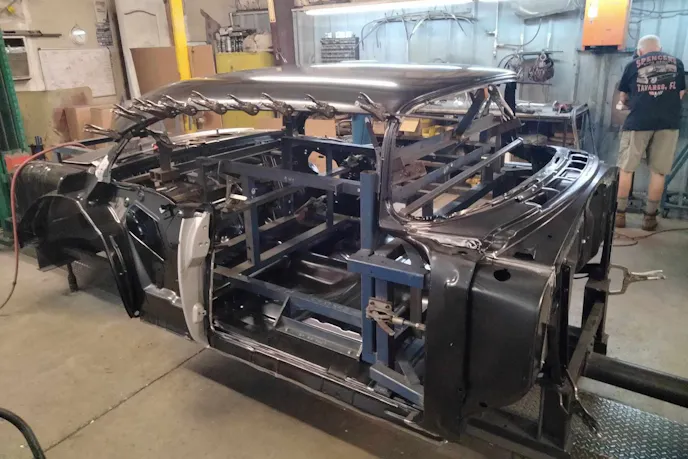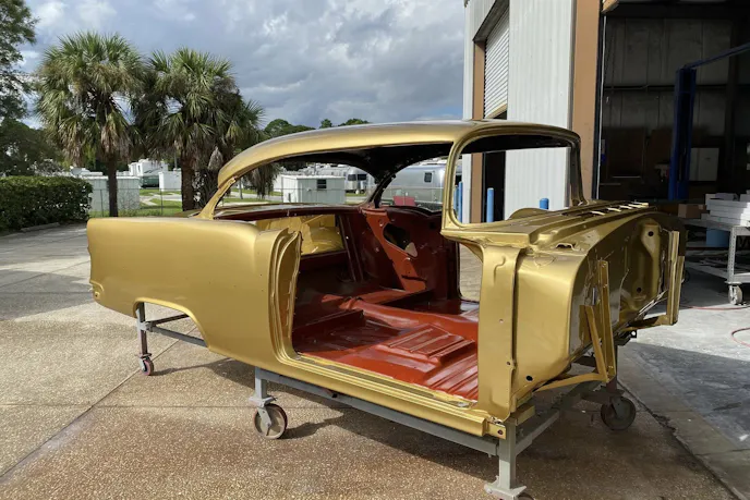 The crew at Real Deal Steel assembled the body for the Tribute ’55 Chevy from reproduction steel components.