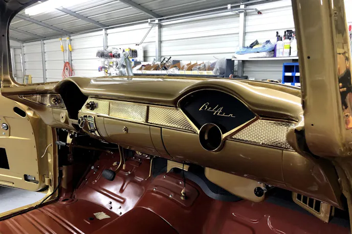 Sourcing the gold plating of 600-plus pieces of chrome, stainless trim, nuts, bolts, screws, and other pieces fell on the shoulders of Southern California’s Omar Asad and his cousin, Nader Suliman. Omar started gold plating parts for his cars as a hobby that grew into a small business when friends and others asked him to plate pieces for them. The plating for the Bel Air was done in 24-karat gold that comes in a liquid form, with chemicals added to help it bond to whatever is being plated. The cost? $5,000 per gallon.