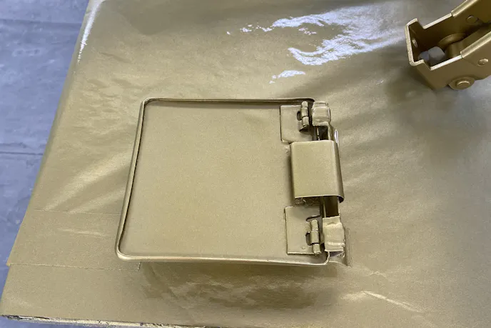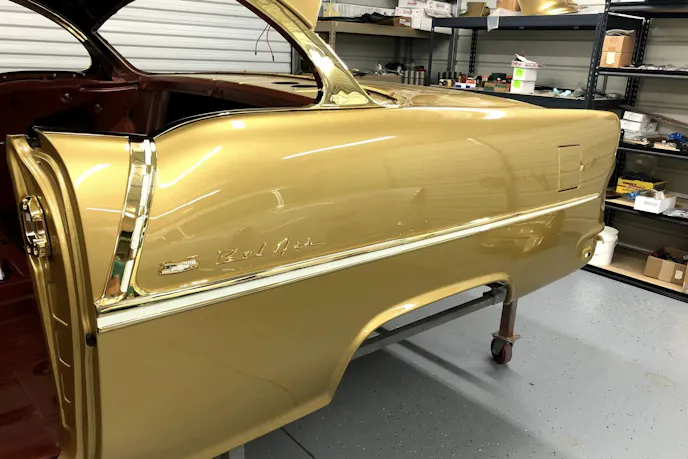 At that point, the car was in what Dave calls rough-stage primer. Then the car is blown apart – again – and panels are re-blocked, then covered with epoxy primer. The paint used on the original car back in 1954 was a custom mix, but no record of the formula has been found. It was not the special gold that was used on the 5,000 four-door cars that were distributed to dealers. Several sample colors were tested and an Axalta color was selected.