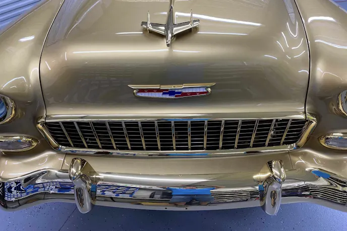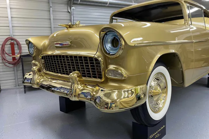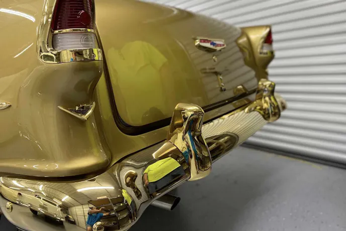 Dave Snodgrass Chevy Restoration of Melbourne, Florida is one of the premier classic Chevy restorers in the country. Dave, Kenny, and Michael massaged the body, applied gallons of gold paint, and assembled the finished car. California-based Omar Asad and his cousin Nader Suliman spent long days gold-plating more than 600 pieces of trim, the bumpers; hundreds of nuts, bolts, and screws. Ciadella Interiors of Tempe, Arizona, found original NOS fabric and recreated the intensely gold interior pieces. Other industry suppliers who provided various components for the car include Golden Star Classic Auto Parts, Shafer’s Classic Reproductions, American Autowire,Auto City Glass, and Gene Smith Parts.