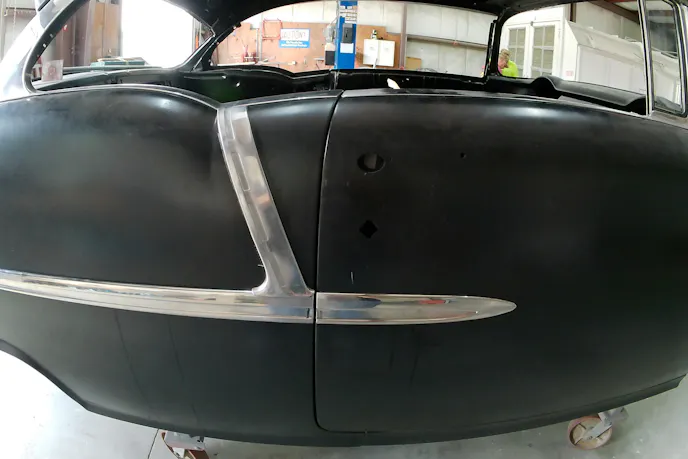 Regardless of the starting point, making original pieces or reproduction parts fit presents different challenges. “The fit and finish that we are going after, everything on that car – door handle, taillight bezel – we are so anal that you have to fit every piece on that car,” Dave says. “It doesn’t matter what it is, it has to fit the body.” That means building, disassembling, and rebuilding the car two or three times during the journey from delivery to finished paint. First, the coating on the body from Real Deal Steel was stripped and every piece was covered in epoxy primer. Then the car was put back together.