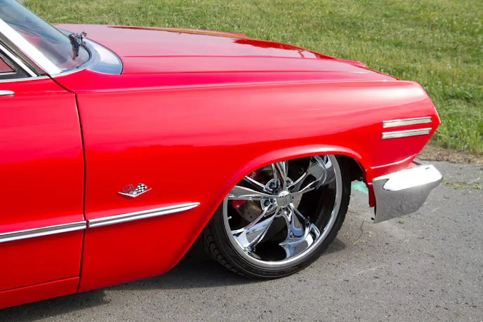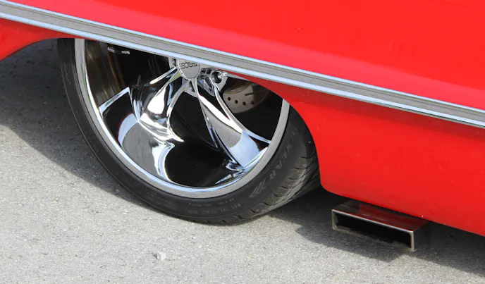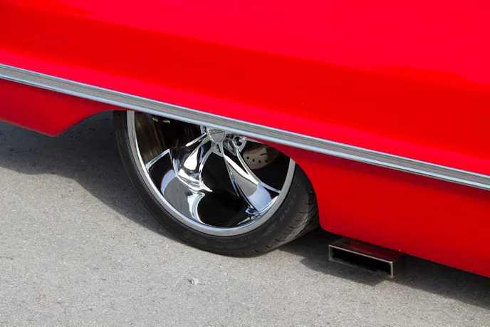 Kicking off stage one of the build, Chris decided to focus on the stance of the car. 1963 Chevy Impalas did not exactly roll off the General Motors assembly line with a ground hugging and adjustable stance back in the day, but Chris remedied this with a full Air Ride suspension setup fitted with Firestone 2,600-lb. airbags on each corner. A five gallon chrome air tank keeps plenty of air on tap for the Air Zenith compressor and the entire system is controlled with an AccuAir e-Level Air Ride Suspension Controller. Adding to the killer stance is a set of Foose Legend chrome wheels with 20×8.5-inchers tucked under the nose and fat lipped 22×9.5-inchers in the rear, all of which are wrapped in 245/30/20 and 265/35/22 Goodyear Eagle GT rubber, respectively. Finishing off the exterior appeal is a fresh PPG Viper Red paint job, applied by the owner, one-piece front and rear Carolina Smoothie bumpers, and chrome plated aluminum trim.