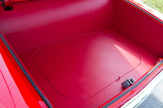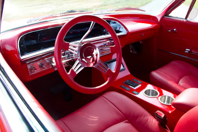 In stage two of the build, Chris decided to tie the whole package together with a highly contemporary interior. From the Dakota Digital gauge in the dash, to the Buick Lacrosse bucket seating with a custom fiberglass center console, all the way to the split rear seating and trunk area, nothing inside this car resembles what GM intended back in 1963. Using red leather and matching red vinyl floor covering, Chris created a clean and contemporary interior for the Impala. A leather wrapped Billet Specialties steering wheel tops off the chrome steering column and a chrome column shifter controls the transmission. Other contemporary conveniences include power windows and keyless door locks.