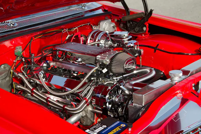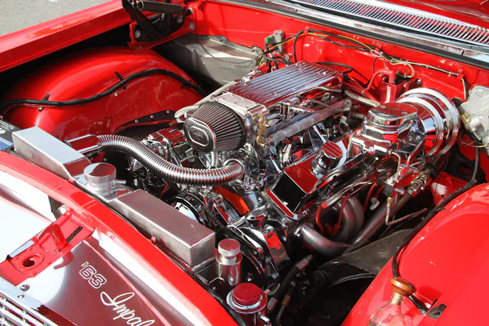 Kicking off stage one of the build, Chris decided to focus on the stance of the car. 1963 Chevy Impalas did not exactly roll off the General Motors assembly line with a ground hugging and adjustable stance back in the day, but Chris remedied this with a full Air Ride suspension setup fitted with Firestone 2,600-lb. airbags on each corner. A five gallon chrome air tank keeps plenty of air on tap for the Air Zenith compressor and the entire system is controlled with an AccuAir e-Level Air Ride Suspension Controller. Adding to the killer stance is a set of Foose Legend chrome wheels with 20×8.5-inchers tucked under the nose and fat lipped 22×9.5-inchers in the rear, all of which are wrapped in 245/30/20 and 265/35/22 Goodyear Eagle GT rubber, respectively. Finishing off the exterior appeal is a fresh PPG Viper Red paint job, applied by the owner, one-piece front and rear Carolina Smoothie bumpers, and chrome plated aluminum trim.