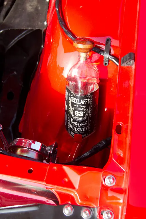 In the final stage of the build, Chris focused on the Impala’s power plant. Tucked away neatly under the hood, is a potent Holley Stealth Ram fuel injected 350 Chevy engine bored .030 over and fitted with aluminum heads and a 268 Comp Cam, providing as much flash as it does dash. What’s not chromed or stainless has been painted orange. To help the engine breathe a little easier, a custom side exit dual exhaust system, fitted with shorty ceramic coated headers and a pair of Flowmaster 2.5-inch mufflers, was bent up and assembled between the frame rails. A Chevy Turbo 350 tranny controls all the action, while the braking system, consisting of Wilwood calipers and Classic Performance Products cross drilled and slotted rotors, keep all the ponies in check.