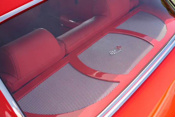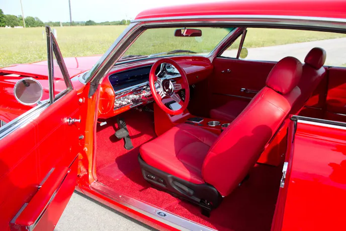 In stage two of the build, Chris decided to tie the whole package together with a highly contemporary interior. From the Dakota Digital gauge in the dash, to the Buick Lacrosse bucket seating with a custom fiberglass center console, all the way to the split rear seating and trunk area, nothing inside this car resembles what GM intended back in 1963. Using red leather and matching red vinyl floor covering, Chris created a clean and contemporary interior for the Impala. A leather wrapped Billet Specialties steering wheel tops off the chrome steering column and a chrome column shifter controls the transmission. Other contemporary conveniences include power windows and keyless door locks.