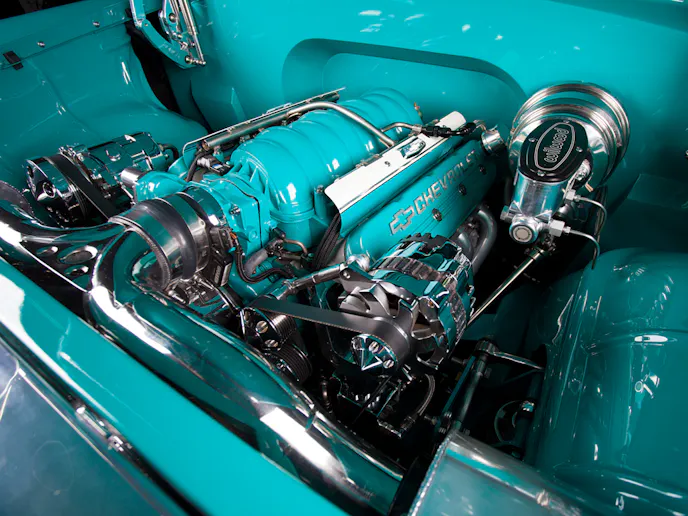 It is immediately obvious that the coloring under the hood is not the standard one might expect. The stock LS2 intake manifold has been meticulously smoothed and painted the same color as the body, with the engine block and valve covers painted to match. The stock LS2 stainless-steel fuel rails are polished, and there are fabricated covers that hide the injectors and wiring. The covers use a similar two-tone paint scheme to mimic the outside of the car. The serpentine system is from Street and Performance, and has been chrome plated. The guys at Hot Rod Dynamics smoothed the firewall, which does wonders to clean up the engine bay, and a hidden Raingear wiper system is located inside the car to get rid of the stock wiper motor.