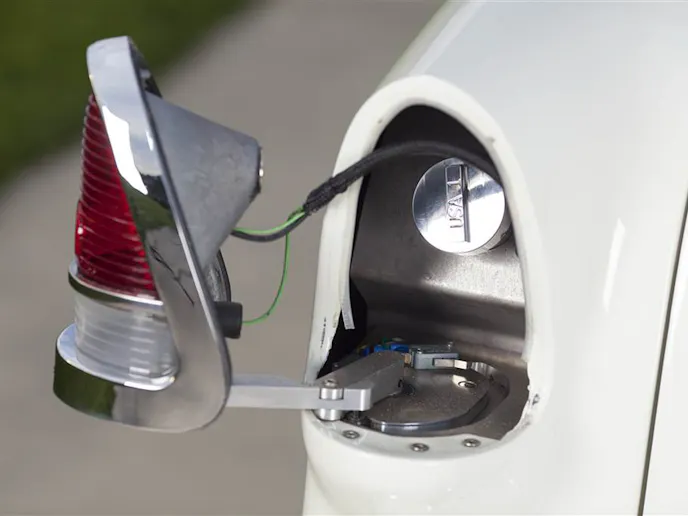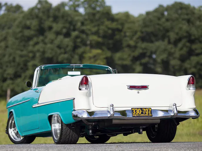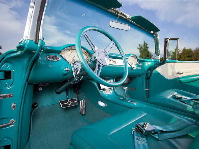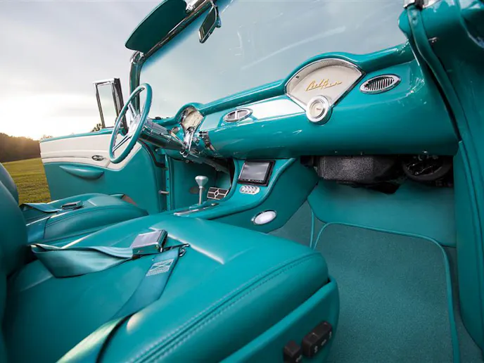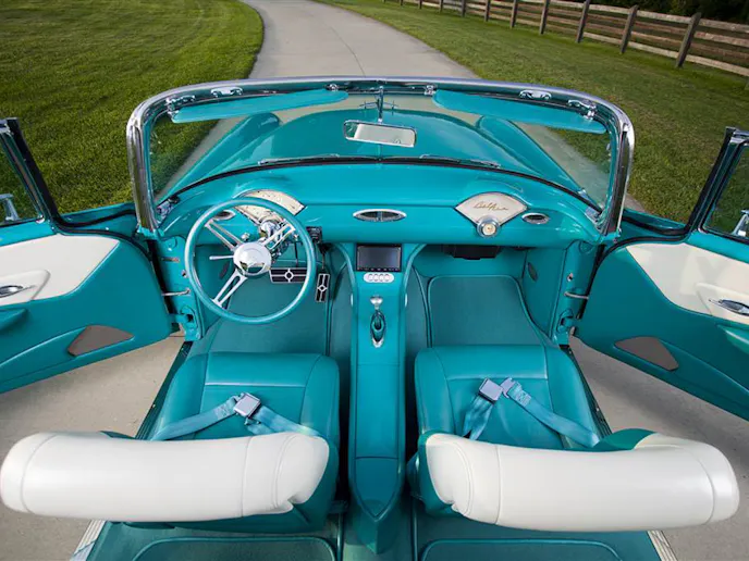 The PPG paint was applied by Chip Strickland of Strickland Automotive in the original colors of Indian Ivory over Turquoise. Although it sits a little lower than stock and the wheels give a little insight into the fact that the car has been modified, other than that, it looks stock. The top, along with everything else, is powered, and can be activated via a wireless remote. You will also notice that this car takes a page out of the ’56 and ’57 Chevy’s playbook, as Joe moved the gas filler under the driver’s side taillight housing, and is electronically controlled.
