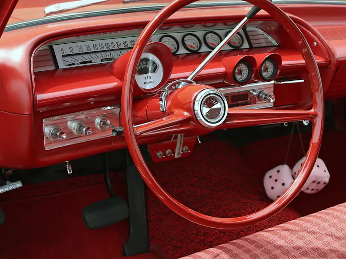 There were several upgrades made to the car that carried it further from its fleet roots, such as the four-wheel power disc-brakes from The Right Stuff Detailing, a factory 409 tachometer, and even an air-ride suspension to give the car that “just right” stance for any occasion.