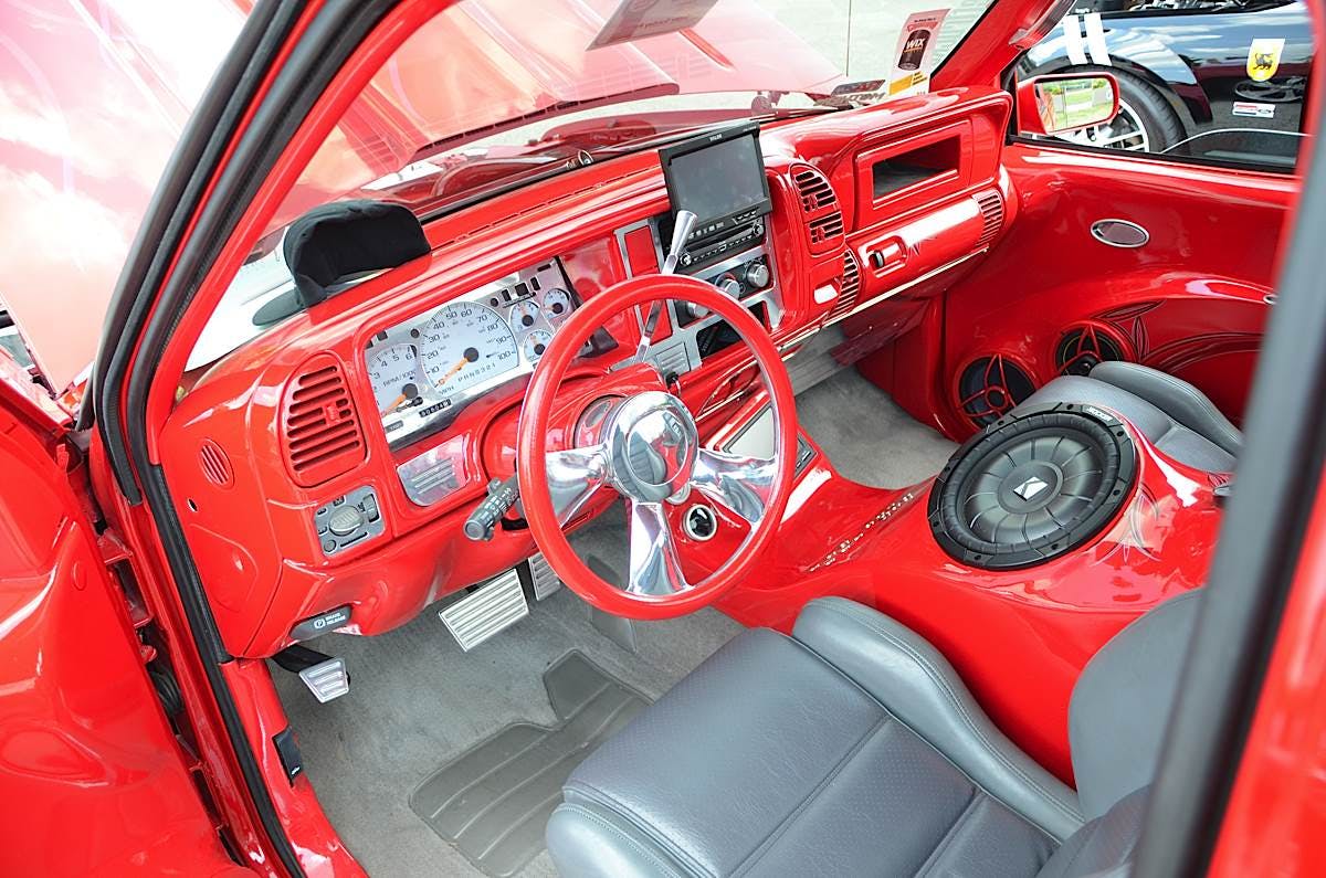 Even the headliner received the glass treatment. You’ll also notice that the dash has been sanded, smoothed, and shaped out before being painted red to bring the outside in. If it wasn’t painted red on the inside, it was covered with billet aluminum. So what are Mike’s next big plans? “Well, I’d like to have it repainted… I’m still in love with red so it’s definitely gonna be red, maybe even with some of the old-school hotrod pinstriping to add nice accents. I also plan on shaving everything too. Door handles, tailgate handle, everything. It’s gotta go” Mike told me. With the continued support of his wife and two daughters, as well as all of his friends, we can believe it will only be a matter of time before we see another massive transformation for this truck at the next Goodguys show in his area.